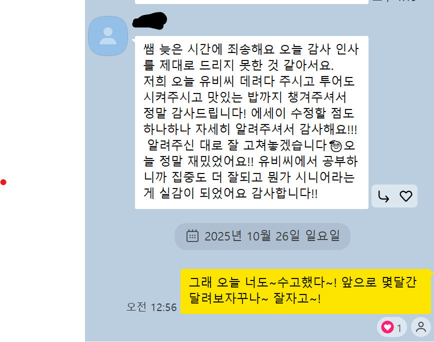 우리 12학년 학생은 밤늦게 감사하다며 이렇게 정성스런 문자도 보내왔어요~