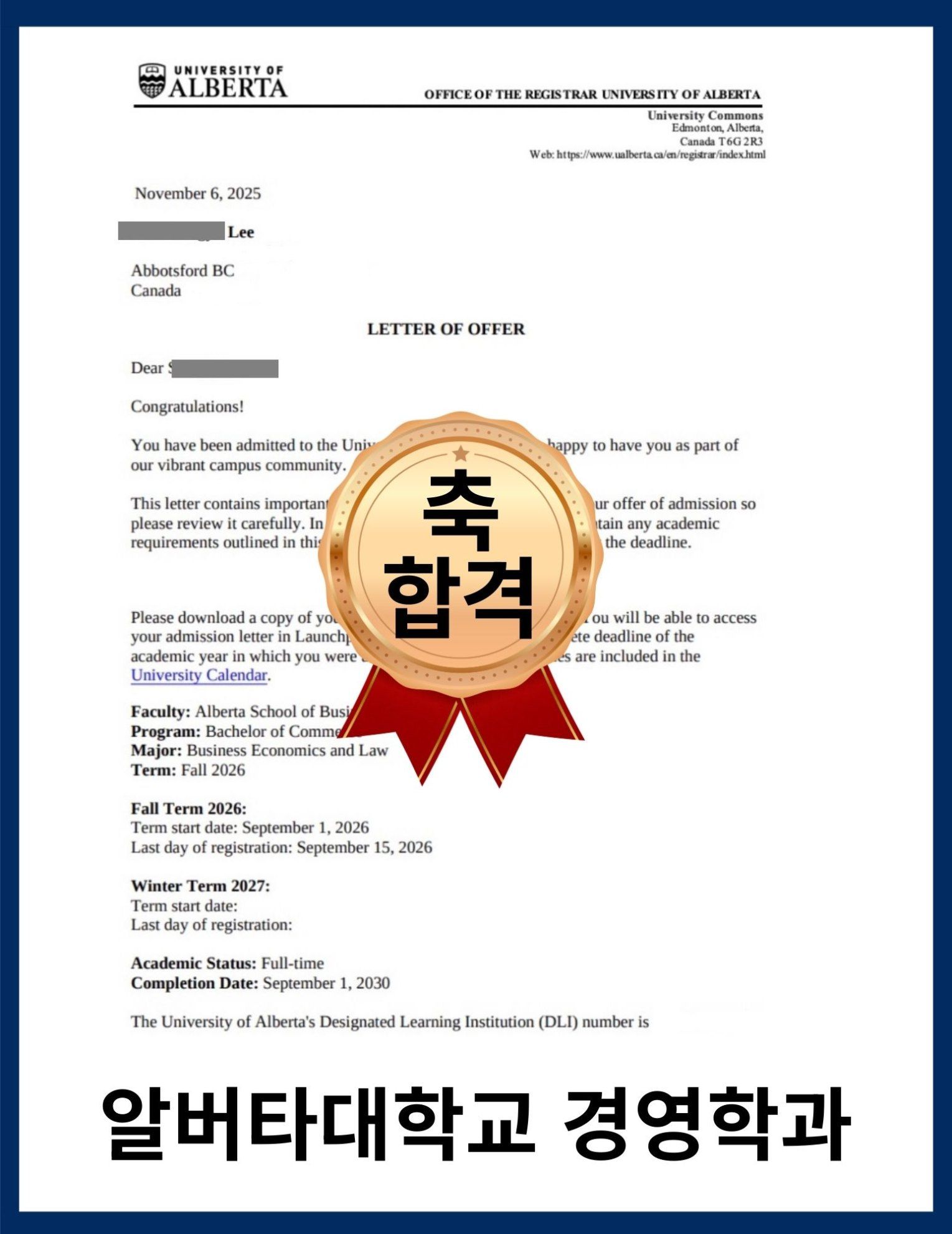알버타 대학교 경영학과 수시 합격을 했답니다.