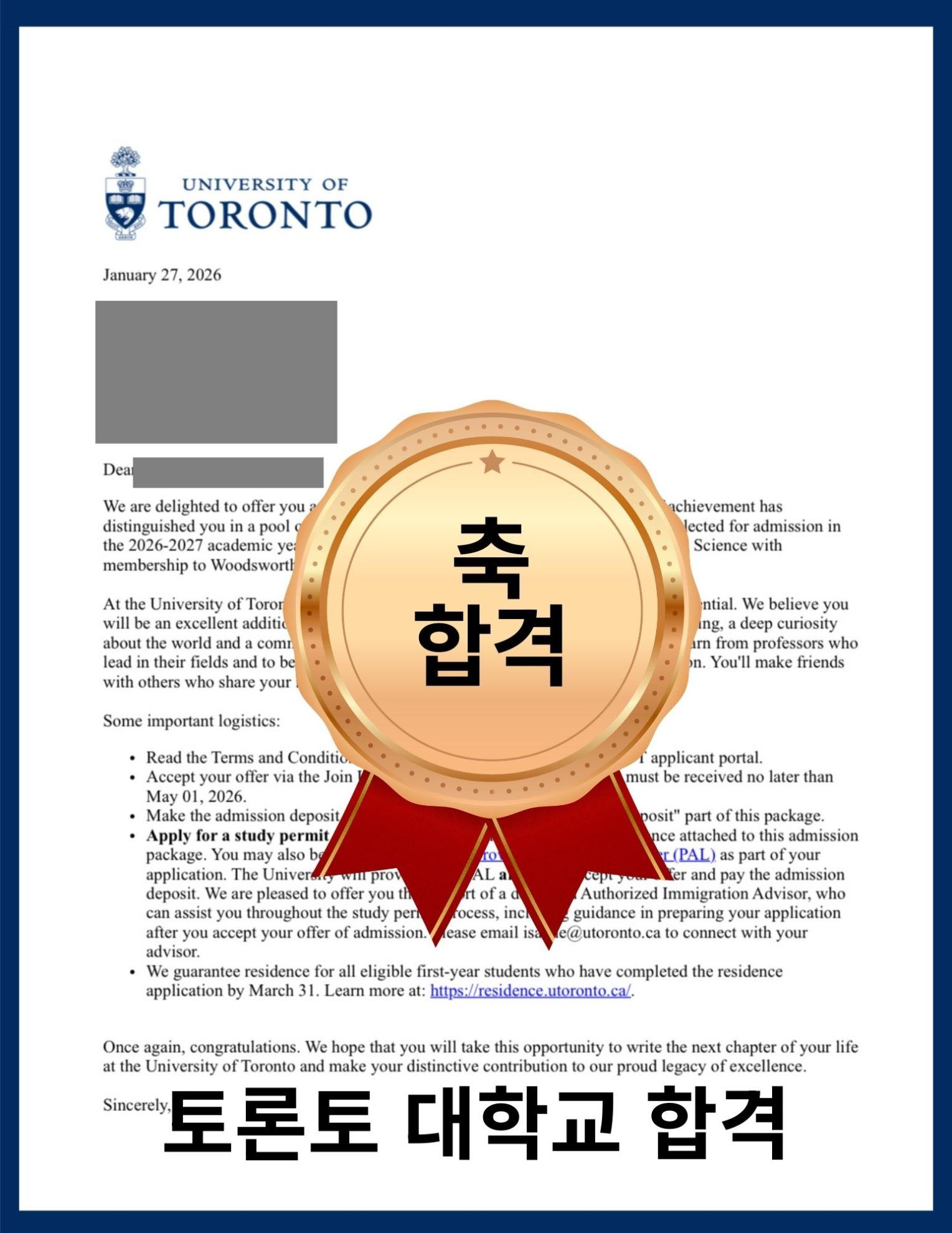 우리 Koh ** 학생의 토론토 메인캠퍼스 합격을 축하합니다